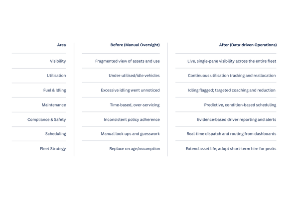 Headline outcomes: $1.1m in capital expenditure avoided, lower fuel and servicing costs, right‑sized fleet, improved compliance and driver safety, faster dispatch and coordination.